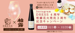 柏露酒造公式Instagramアカウントをフォローし、キャンペーン対象の投稿にコメントをしていただいた方の中から、抽選で6名様に「DRESS 4周年・柏露花火3周年記念コラボセット」をプレゼントいたします。